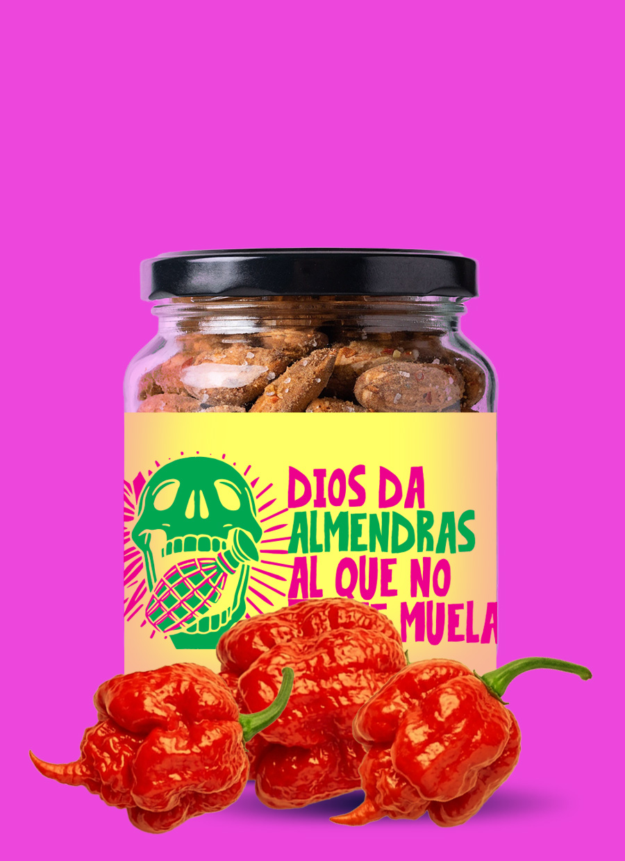 Almendras españolas seleccionadas, perfectamente tostadas y recubiertas sin piedad con uno de los chiles más picantes del planeta: el Carolina Reaper.